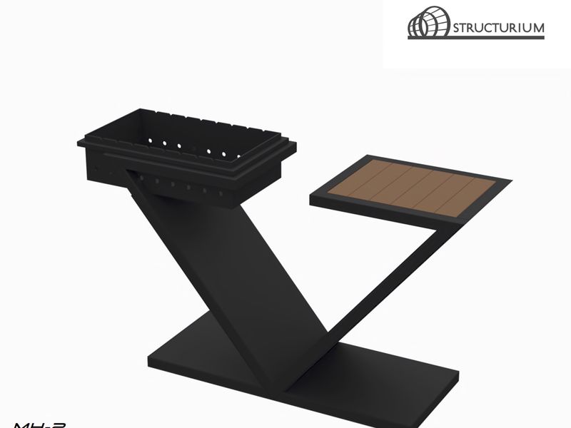 При производстве Мангала используется профильная труба 20*20*2мм, а также лист 3мм. Обшивка металлокаркаса производится листом 2мм. Материал столика – доска 75*32мм обработанная атмосферостойким покрытием. Покраска термостойкой краской, цвет черный.